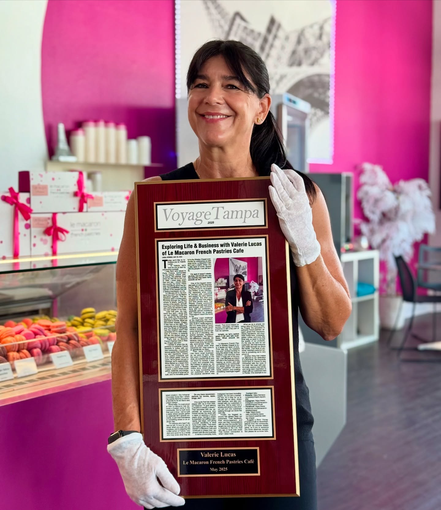• A smiling customer holding their plaque